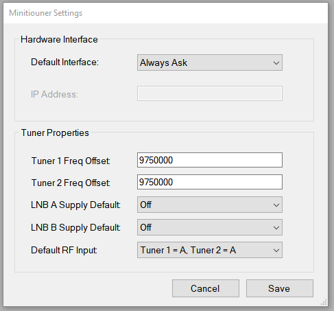 - Tuner 2 Freq Offset: Depending on how you use it you might need to specify an offset (it currently defaults to 9750000)